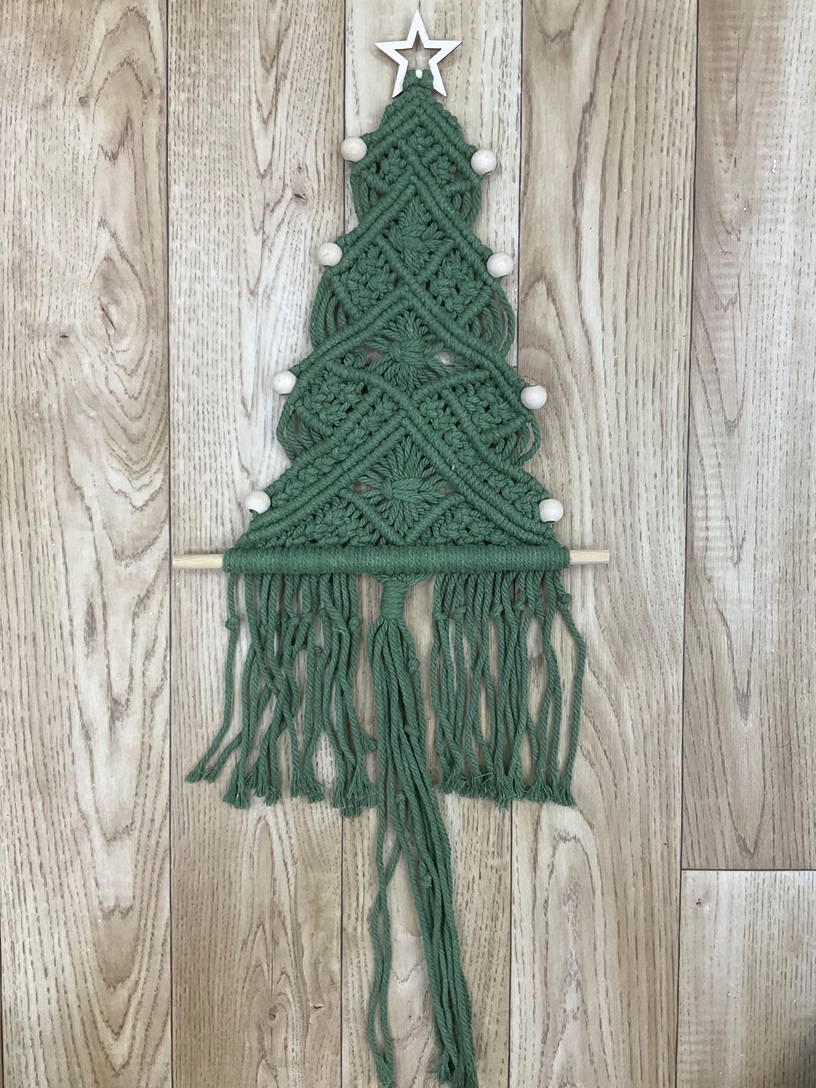 A handmade green macrame Christmas tree wall hanging with a star topper and white bead accents.