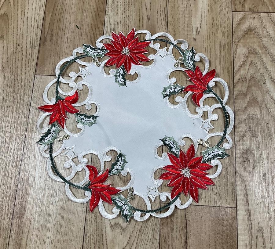 Elegant table topper featuring embroidered poinsettias and holly leaves, perfect for holiday decor.