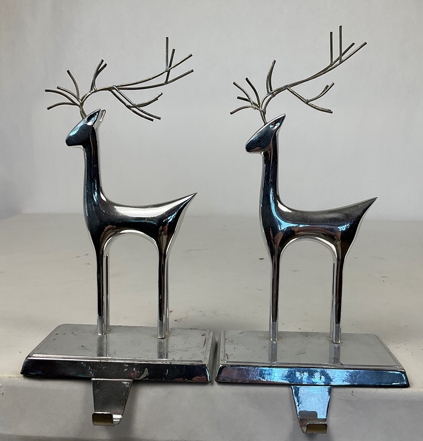 Sleek metallic reindeer stocking holders ideal for mantels or shelves to add a contemporary holiday touch.